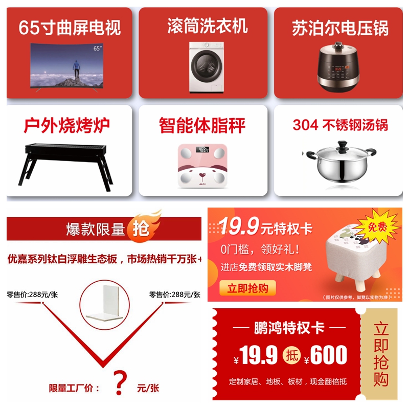 鵬鴻板材、定制家具、木門、地板等產(chǎn)品平均讓利50%,只要支付6.6元認購金,即可鎖定優(yōu)惠,先到先得。