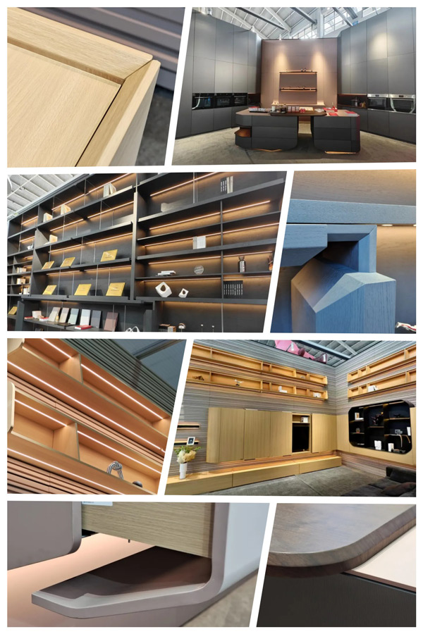 鋼琴格柵、45度斜邊收口、“三明治”板材工藝及非規(guī)則圓弧設(shè)計(jì)……多元美學(xué)融合,呈現(xiàn)全新家居意境。應(yīng)用上,ENF級(jí)環(huán)保,4.5米通頂家居,第三代顆粒板、碳晶飾面板……為與會(huì)觀眾帶來(lái)高顏值、高個(gè)性化、高品質(zhì)的整家美學(xué)方案。