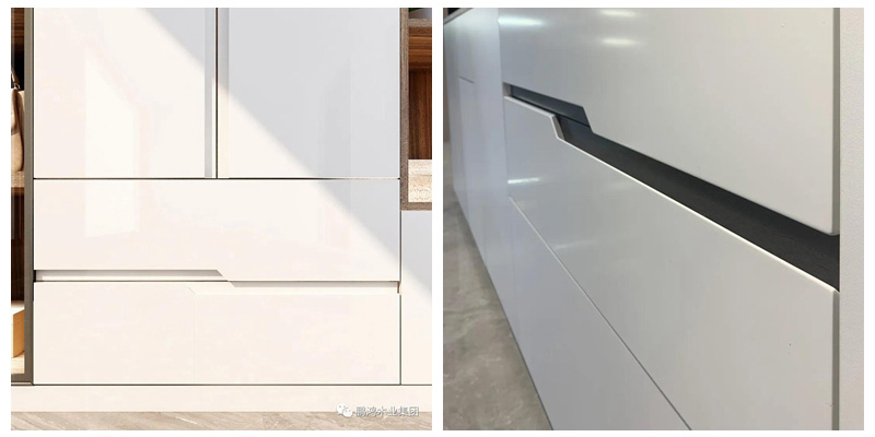 45°角的內(nèi)向斜切,25mm槽寬,隱形的凹槽式拉手化有形于無形,符合人體工程學(xué),保證每次柜門開合時(shí)的舒適手感。